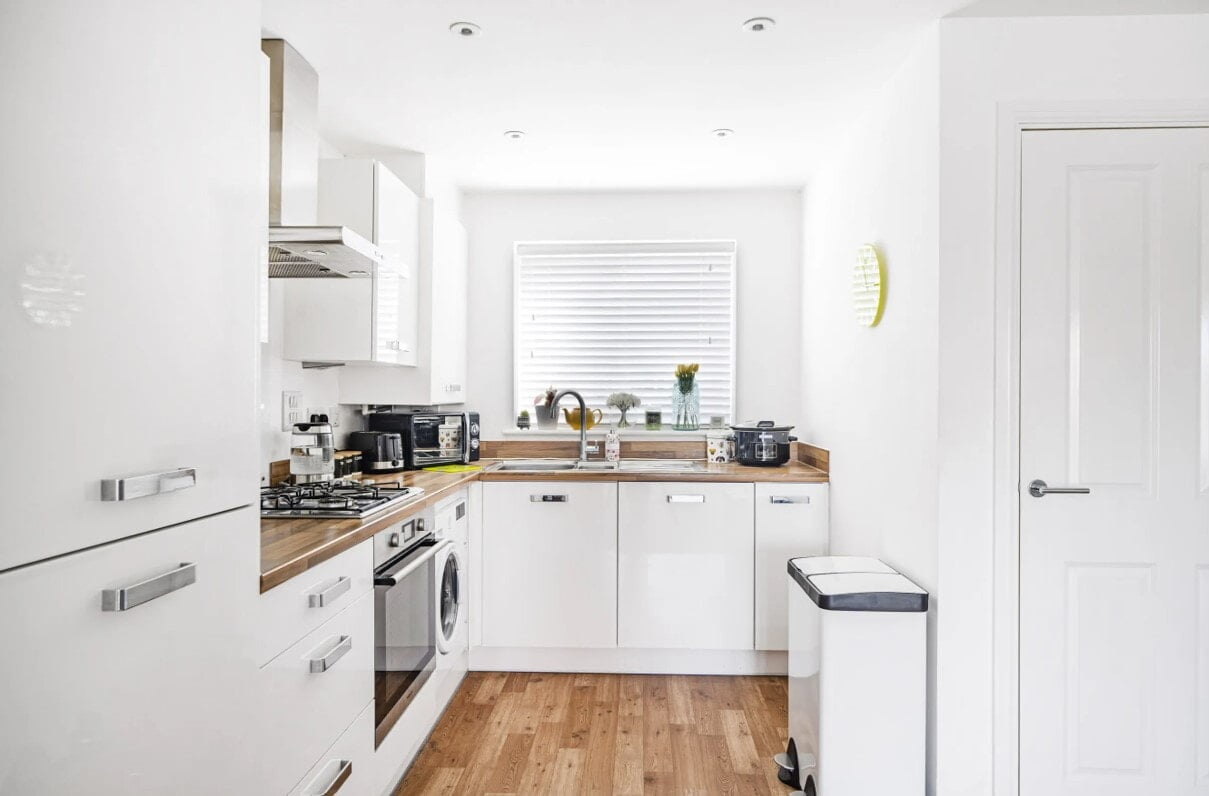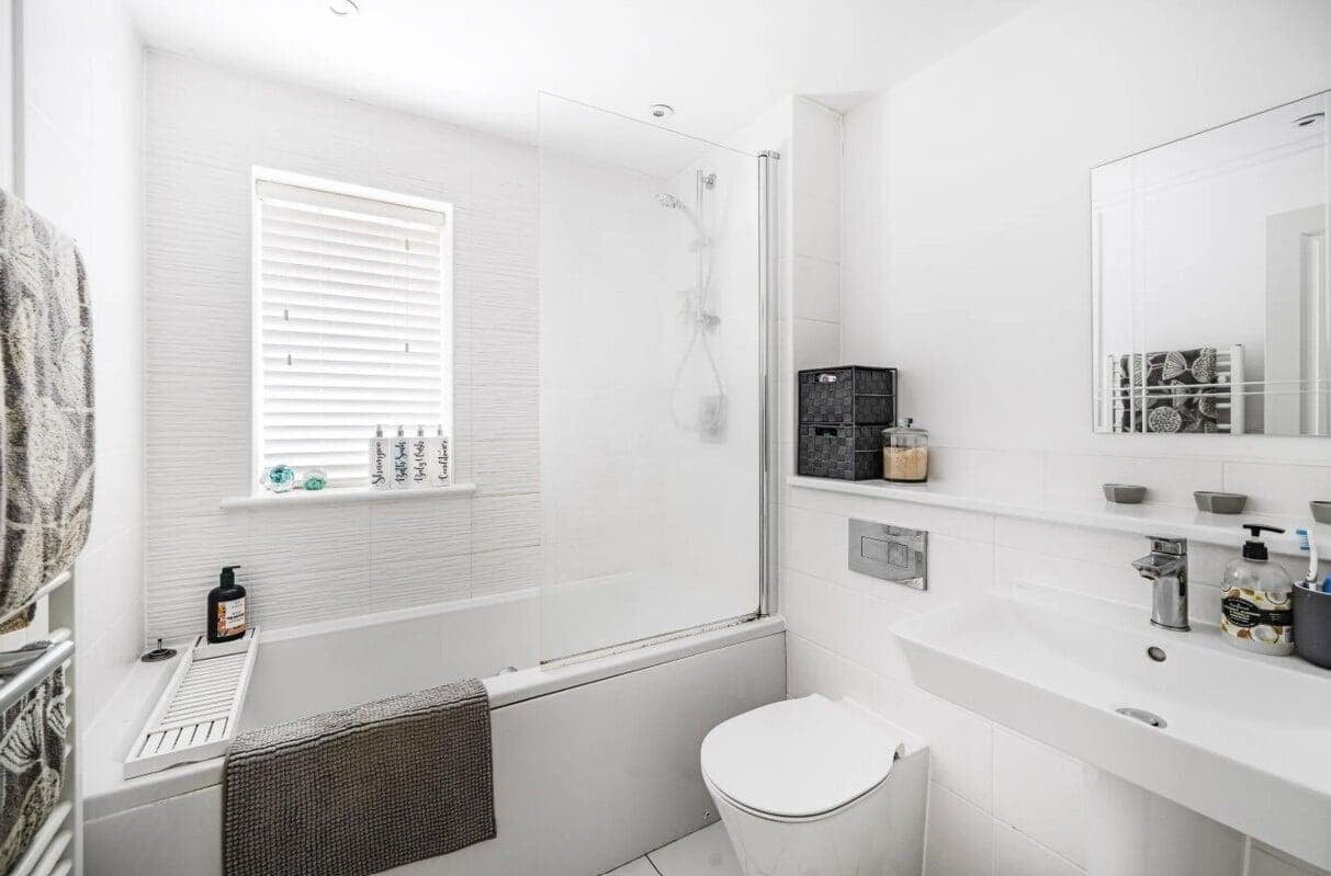 This smartly-presented, mid-terrace property has a cloakroom just off the entrance hall with the rest of the ground floor devoted to a full-length kitchen/reception room with sleek, white units, integrated appliances, windows to front and rear and patio doors that open onto the garden.