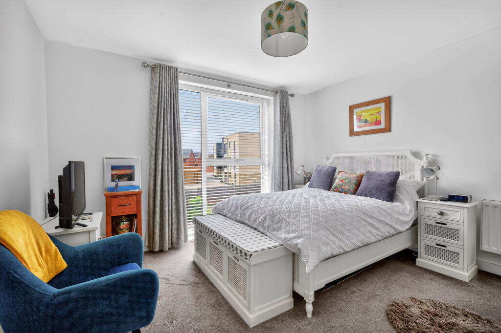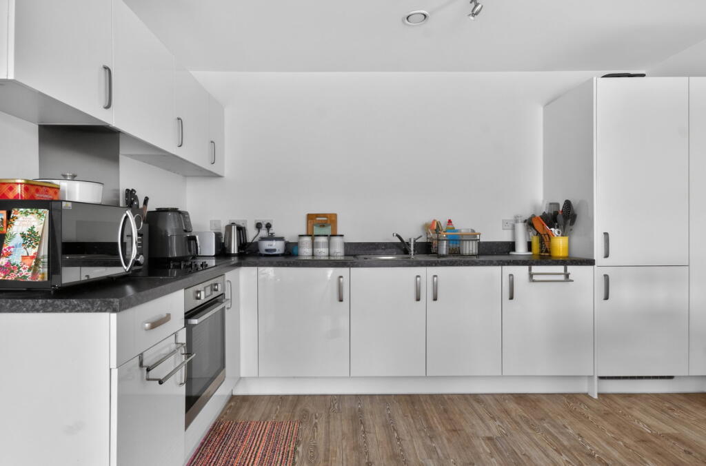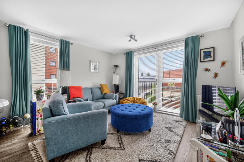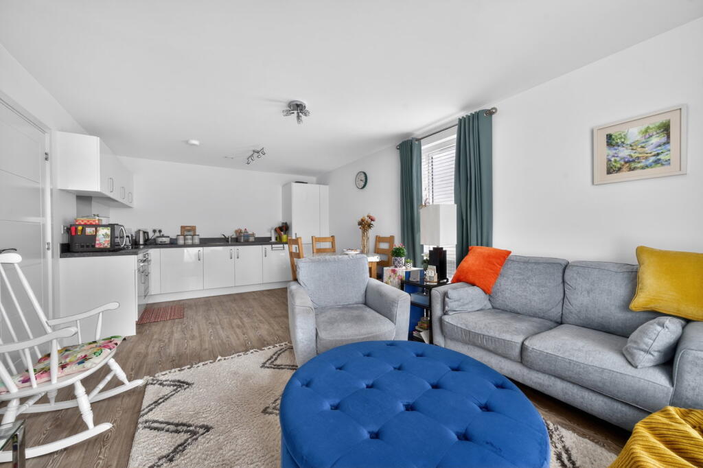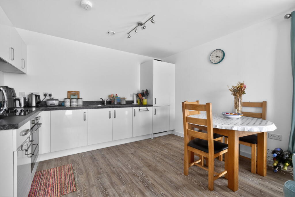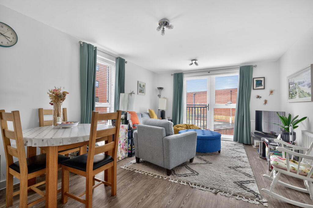 This contemporary two‑double‑bedroom first‑floor apartment is finished to a high specification throughout and forms part of a stylish development built by Crest Nicholson approximately five years ago. Accessed via a secure communal entrance with lift and stair access, the apartment opens into a private hallway with a useful utility cupboard. The generous open‑plan kitchen, dining and living space enjoys a bright dual‑aspect layout with a Juliet balcony, creating an ideal environment for modern living. The kitchen is fitted with integrated appliances including an oven, hob, fridge and freezer.