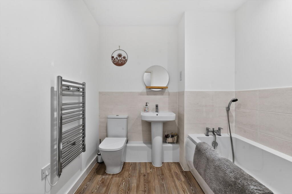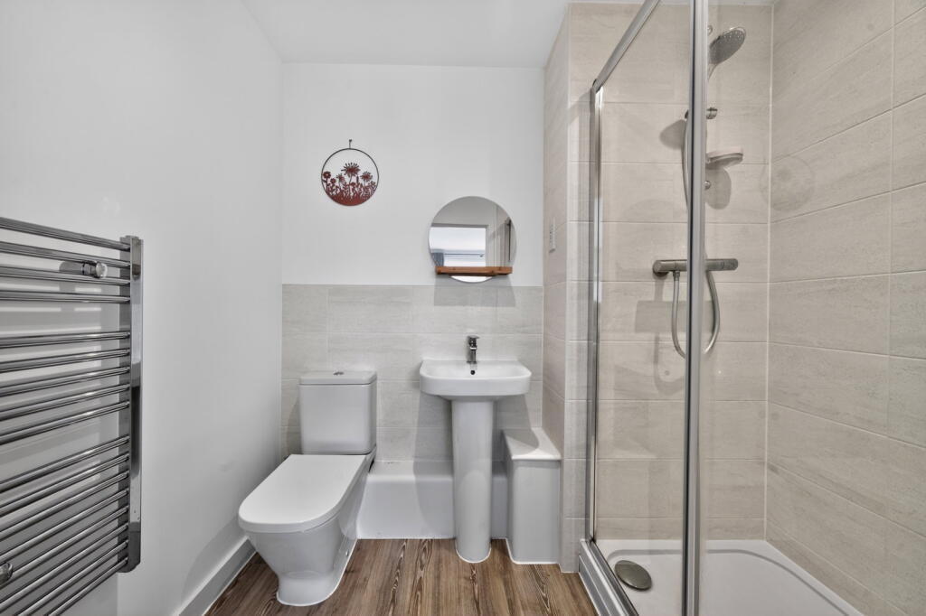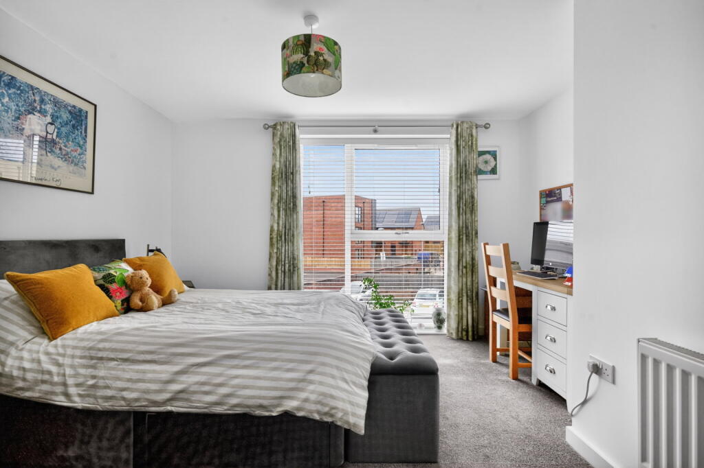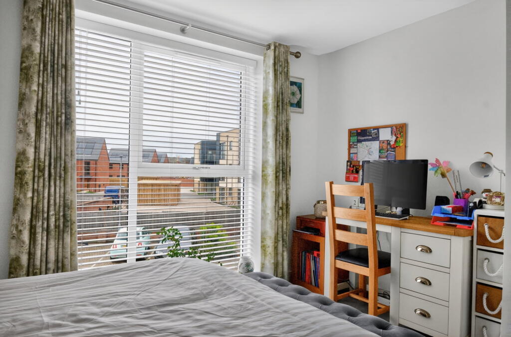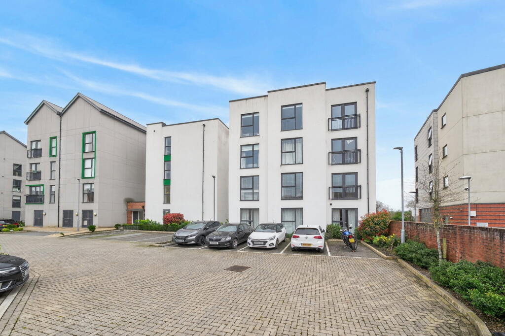 The accommodation further comprises two well‑proportioned double bedrooms, with the principal bedroom benefiting from built‑in wardrobes and a modern en‑suite shower room, alongside a separate contemporary family bathroom. Externally, the apartment enjoys the benefit of an allocated parking space located within a rear courtyard setting. Offered on a 50% shared ownership basis, this home represents an excellent opportunity for first‑time buyers seeking a high‑quality apartment within easy reach of local amenities and transport links.