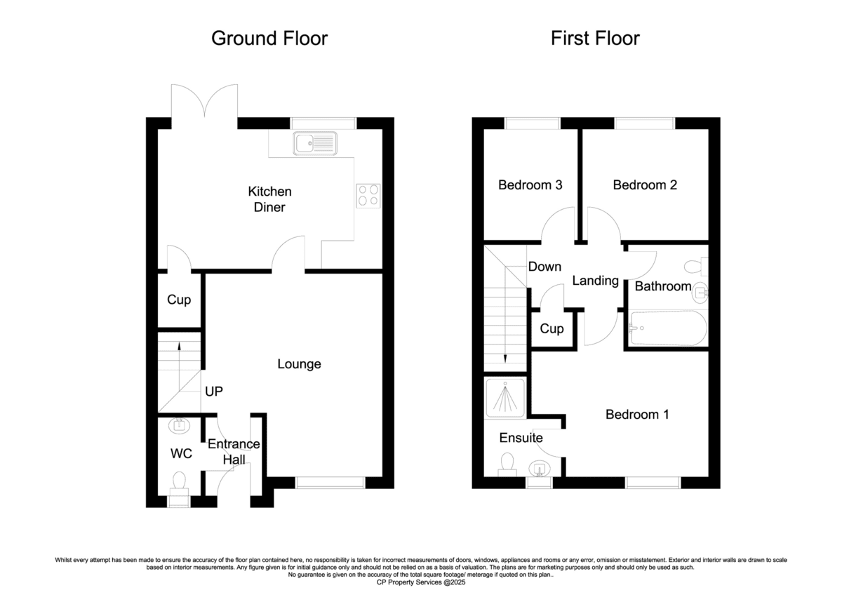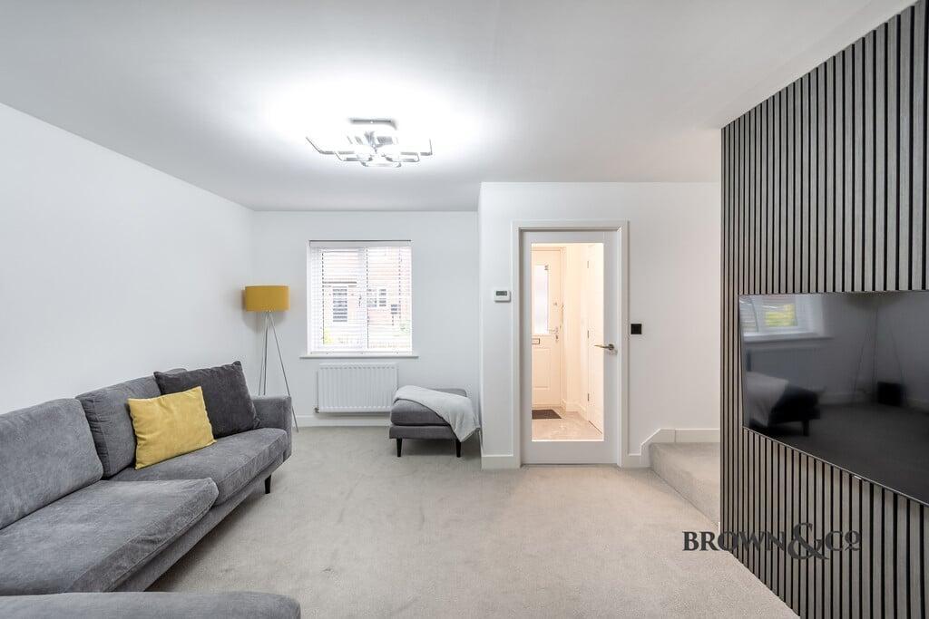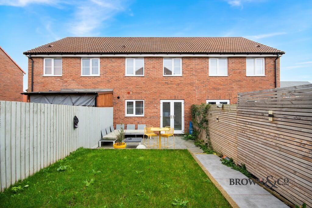 The property is well presented and thoughtfully arranged, offering a comfortable and modern living environment. Accommodation includes an entrance hall, cloakroom, and a spacious living room featuring acoustic wall cladding, stairs to the first floor, and French doors opening onto the rear garden. The contemporary kitchen is well equipped with integrated appliances, ample work surfaces, and useful under-stairs storage. Upstairs, there are three bedrooms, including a principal bedroom with an en-suite shower room, along with a well-appointed family bathroom. Outside, the home benefits from a small front buffer garden and an enclosed rear garden with paved patio, lawn, rear access, and two off-road parking spaces.