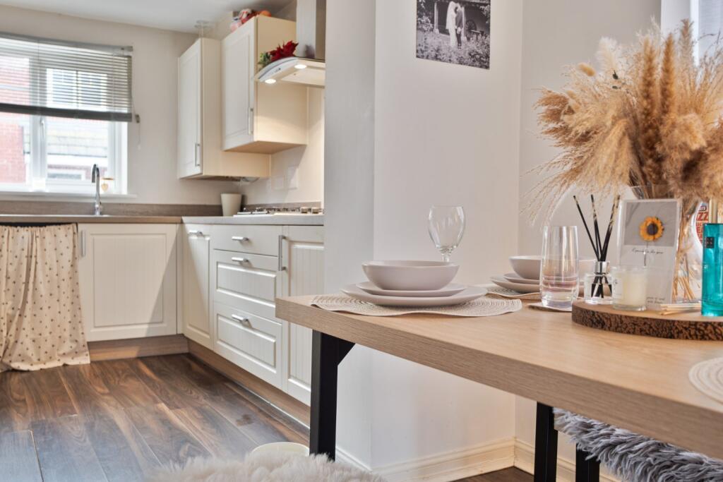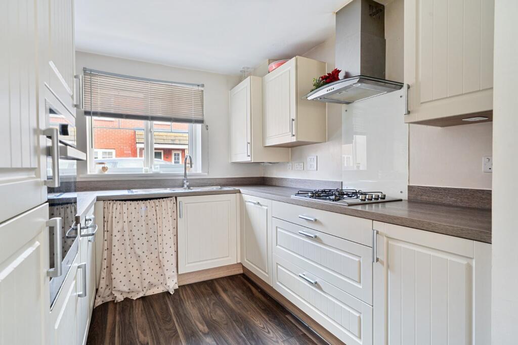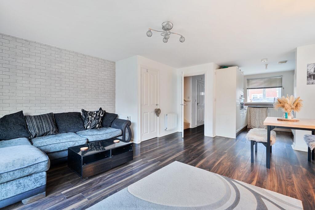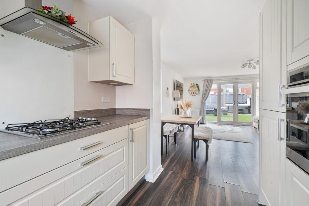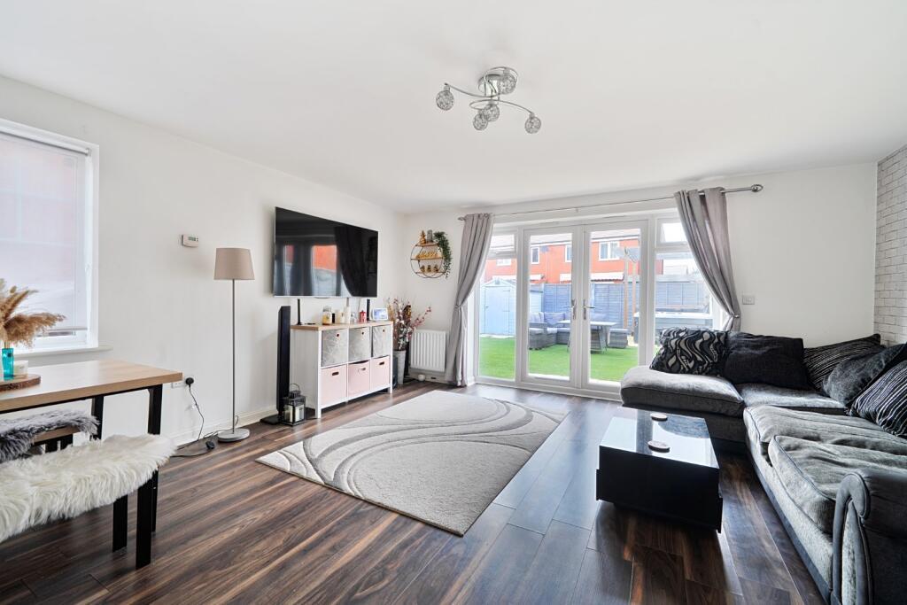 The accommodation includes a fitted kitchen with shaker‑style wall and base units, open‑plan to a bright living and dining area with French doors opening onto the rear garden, providing excellent additional reception space. Upstairs, there are two double bedrooms and a single bedroom, with the main bedroom benefiting from an en‑suite shower room, alongside a modern family bathroom. Outside, the property offers off‑road parking for two vehicles and a good‑sized rear garden featuring two patio areas and a lawn.